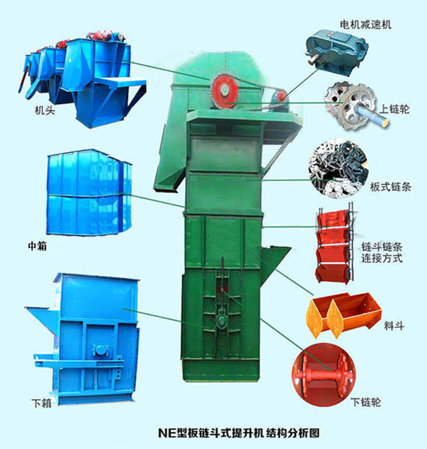 料斗把物料從下面的儲藏中舀起,隨著輸送帶或鏈提升到頂部,繞過頂輪后向下翻轉, 斗式提升機將物料傾入接受槽內(nèi)。帶傳動的斗式提升機的傳動帶一般采用橡膠帶,裝在下或上面的傳動滾筒和上下面的改向滾筒上。鏈傳動的斗式提升機一般裝有兩條平行的傳動鏈,上或下面有一對傳動鏈輪,下或上面是一對改向鏈輪。斗式提升機一般都裝有機殼,以防止斗式提升機中粉塵飛揚。